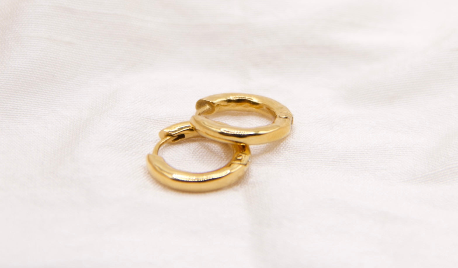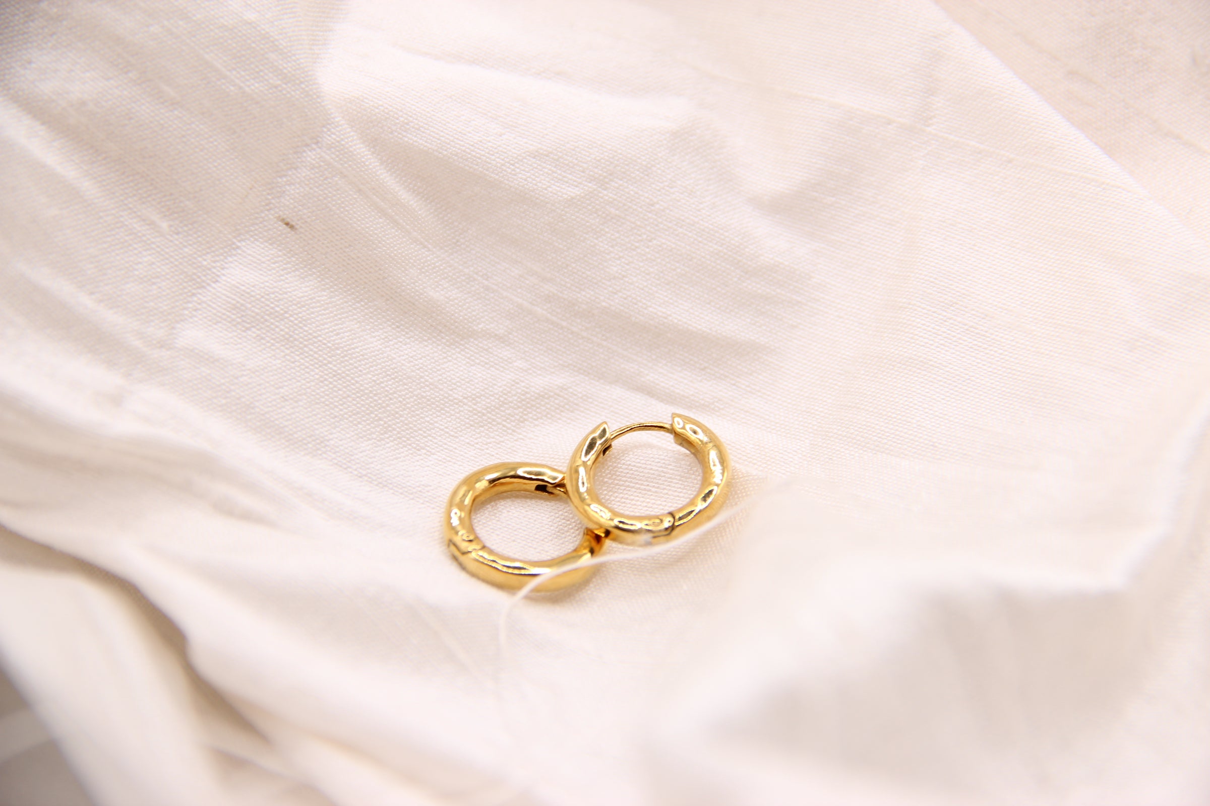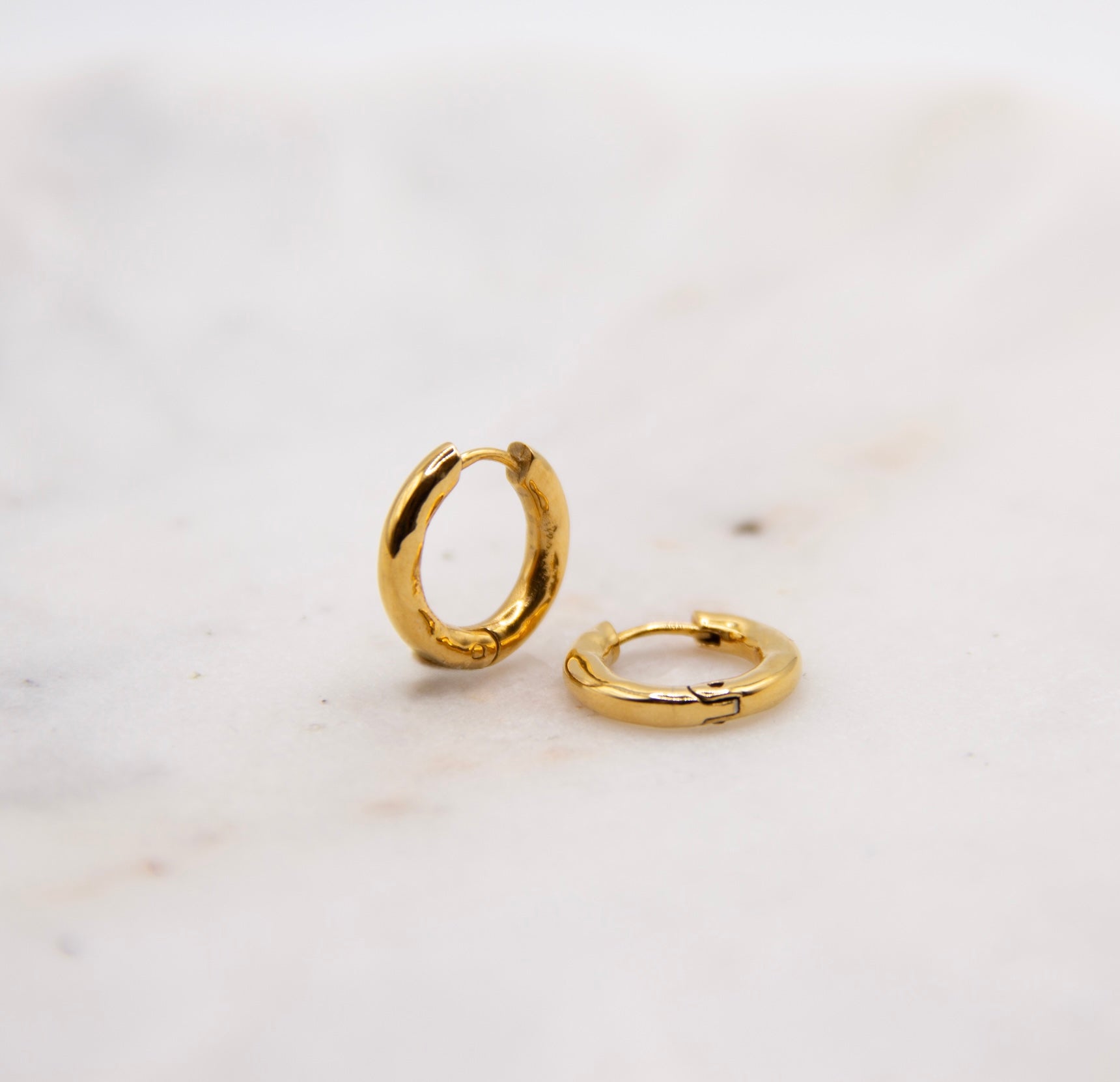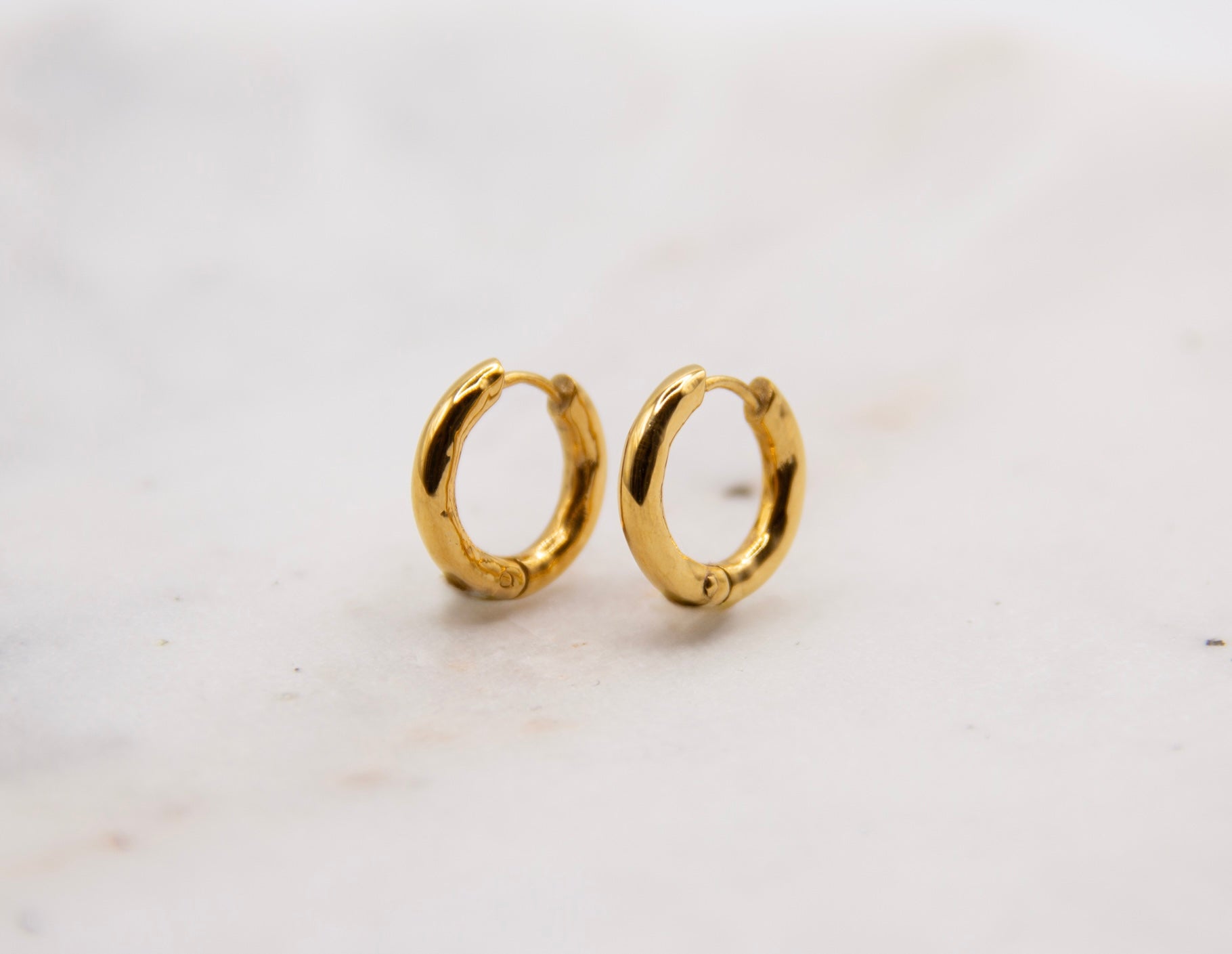 Designed for effortless, everyday wear, these waterproof gold huggie hoop earrings are made to last. Featuring a softly battered texture and a clean, minimal silhouette, they offer a timeless look with a modern edge.